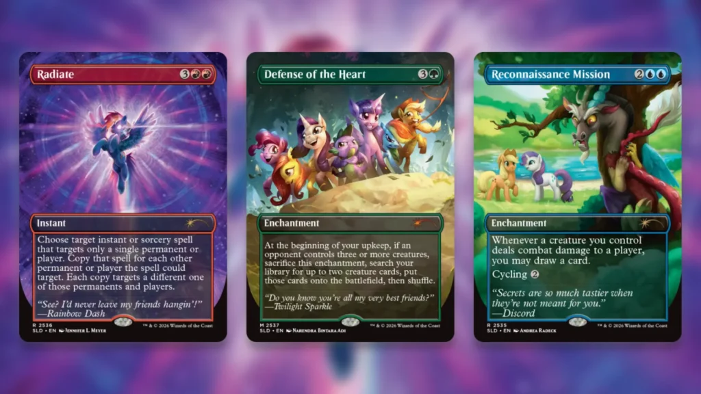 - 「My Little Pony」とのコラボレーション第2弾となる「Secret Lair X My Little Pony: Friendship Is Magic」が登場し、前回の銀枠カードとは異なり、今作はすべて競技イベントで使用可能な黒枠として収録されます。