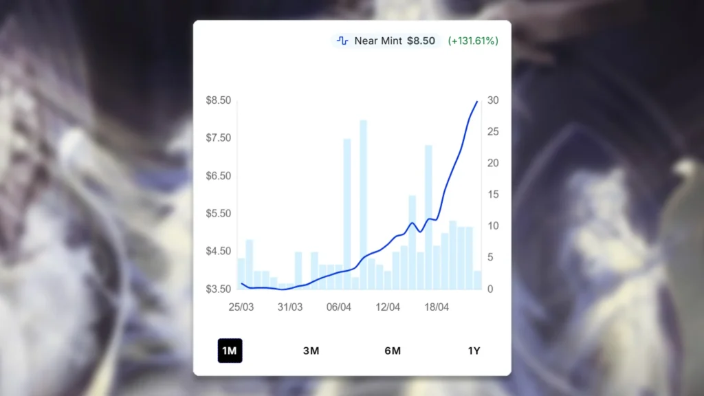 - TCGplayerにおける流通在庫は極めて少なく、ニアミント品の出品はわずか9件、市場全体の合計在庫も約57枚となっており、1日あたり約10枚が売れている現在のペースでは枯渇が近い。